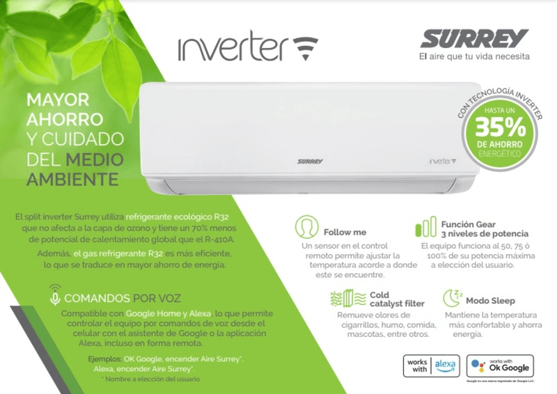 Aire acondicionado Split Surrey Inverter de 2356 kcal con control smart. Este equipo combina eficiencia energética, rendimiento silencioso y control inteligente para ofrecer una climatización confortable en ambientes medianos. Su tecnología Inverter permite un consumo optimizado y un mantenimiento estable de la temperatura ideal, mientras que su diseño moderno se integra fácilmente en cualquier espacio residencial o comercial. Características principales:
